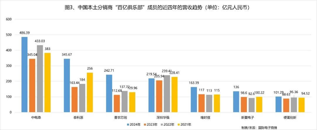 根據(jù)傳統(tǒng),《國(guó)際電子商情》將營(yíng)收超百億元的元器件分銷商劃分為“百億俱樂(lè)部”。2024年共有7家中國(guó)本土分銷商營(yíng)收超百億,同比2023年增加2家,中電港、泰科源、香農(nóng)芯創(chuàng)為T(mén)OP3。