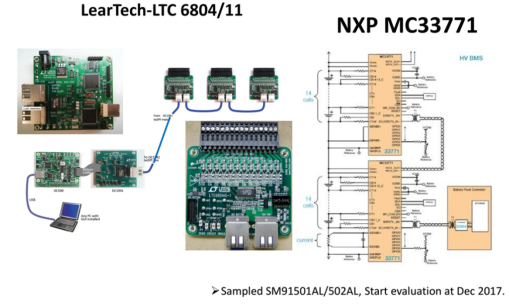 - 分布式包括主板和從板,可能一個(gè)電池模組配備一個(gè)從板,這樣的設(shè)計(jì)缺點(diǎn)是如果電池模組的單體數(shù)量少于12個(gè)會(huì)造成采樣通道浪費(fèi)(一般采樣芯片有12個(gè)通道),或者2-3個(gè)從板采集所有電池模組,這種結(jié)構(gòu)一塊從板中具有多個(gè)采樣芯片,優(yōu)點(diǎn)是通道利用率較高,節(jié)省成本,系統(tǒng)配置的靈活性,適應(yīng)不同容量、不同規(guī)格型式的模組和電池包。