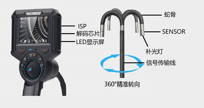 工業(yè)內窺鏡主要由補光燈、SENSOR、蛇骨、信號傳輸線、ISP(圖像信號處理器)、解碼芯片、LED顯示屏組成,由于從SENSOR傳輸出來的圖像是原始圖像所以需要使用ISP在經過BLC、AE、AWB、2D\3D降噪等圖像處理后使圖像達到客戶想要的視覺效果,并通過編解碼芯片對視頻進行編解碼處理以保證內窺鏡長距離、高質量的視頻傳輸效果。