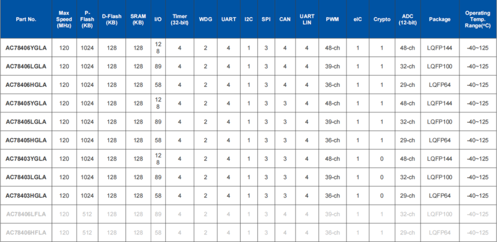 AC7840x是基于ARM Cortex-M4F內(nèi)核的車規(guī)級(jí)MCU,于2022年上市。產(chǎn)品符合AEC-Q100 Grade1, 功能安全符合ISO 26262 ASIL-B,信息安全符合SHE標(biāo)準(zhǔn),支持安全啟動(dòng)。軟件生態(tài)支持AUTOSAR MCAL4.4,可提供MCAL及配置工具。產(chǎn)品擁有雙Bank Flash用于存儲(chǔ)程序,支持OTA。AC7840x可廣泛應(yīng)用于汽車車身、座艙、車燈、新能源以及電機(jī)控制等應(yīng)用領(lǐng)域。