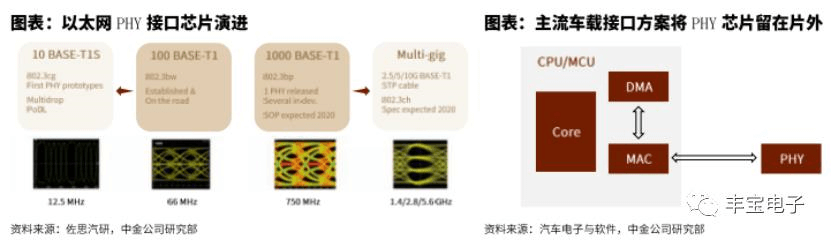 車載以太網(wǎng)目前已廣泛布局各車型中,深入ADAS系統(tǒng)。在硬件層面,車載以太網(wǎng)的接口電路主要由MAC控制器和物理層接口PHY芯片兩大部分構(gòu)成。集成方式上,嵌入式芯片廠商一般會(huì)將MAC集成在MCU/CPU內(nèi)部,而PHY芯片則由OEM或控制器供應(yīng)商提供獨(dú)立芯片。PHY與MAC之間通過MII接口(media independent interface,媒體獨(dú)立接口),在MAC結(jié)構(gòu)不發(fā)生變化的情況下,更換不同PHY芯片不會(huì)影響車內(nèi)通信。