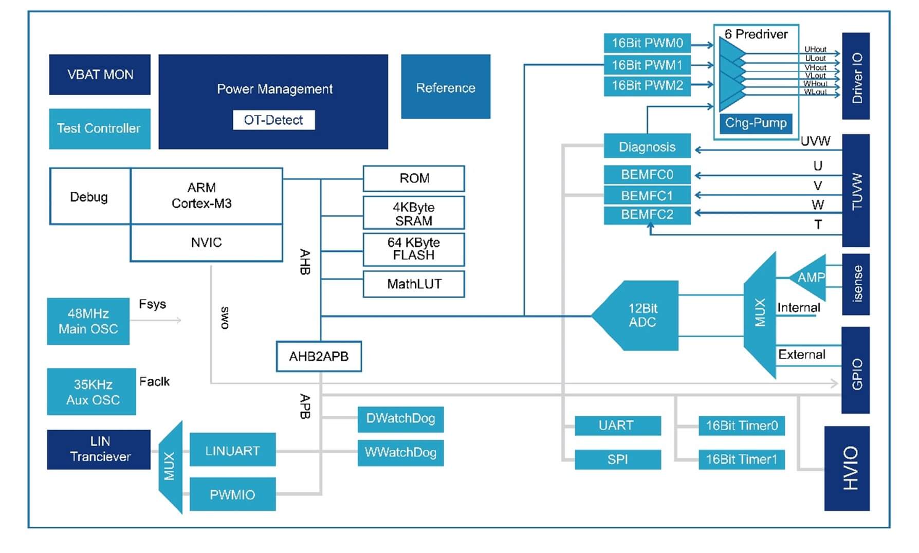 NSUC1610是一種集成驅(qū)動(dòng)和4路半橋的微控制器,主要用于控制小功率直流電機(jī),可支持驅(qū)動(dòng)直流有刷電機(jī)、直流無(wú)刷電機(jī)、步進(jìn)電機(jī)等,在新能源汽車中廣泛使用。該芯片采用先進(jìn)的高溫高壓工藝,節(jié)溫最高可支持到 175°C,電壓耐壓最高可到 40V,且具有過(guò)壓保護(hù)功能,LIN 端口能夠支持-40V~40V 耐壓,BVDD引腳可支持-0.3~40V 耐壓。芯片采用的是ARM Cortex-M3內(nèi)核,該內(nèi)核使用獨(dú)立的數(shù)據(jù)總線和地址總線,能夠提高取指令和取數(shù)據(jù)的效率。