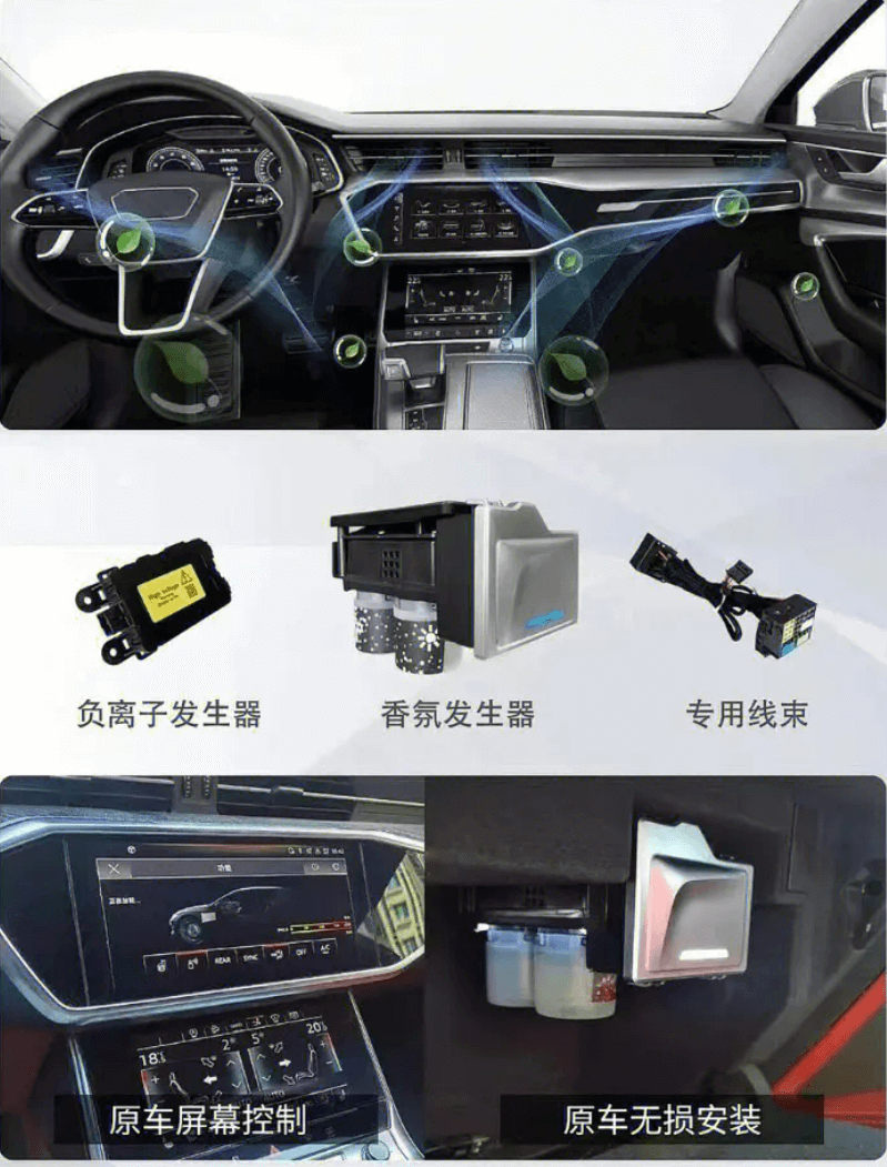 車內(nèi)香氛系統(tǒng)通過專門的香氛器將香氣均勻散布到車內(nèi)每一個(gè)角落。香氛器通常與車輛的?空調(diào)系統(tǒng)相連,通過空調(diào)系統(tǒng)的循環(huán)將香氣均勻地釋放到車內(nèi)。