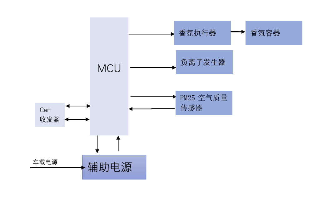 車內(nèi)香氛系統(tǒng)主要由香氛控制器、?香氛?qǐng)?zhí)行器、?香氛容器和?香氛瓶組成。香氛控制器包括記憶模塊和控制模塊,用于存儲(chǔ)多種香氛主題并通過車機(jī)顯示屏向用戶推送。香氛?qǐng)?zhí)行器包括?風(fēng)道、香氛容器、閥門以及?鼓風(fēng)機(jī),當(dāng)不同的香氛主題被選擇時(shí),控制系統(tǒng)向?qū)?yīng)的執(zhí)行器發(fā)送信號(hào),控制香氣濃度和釋放。