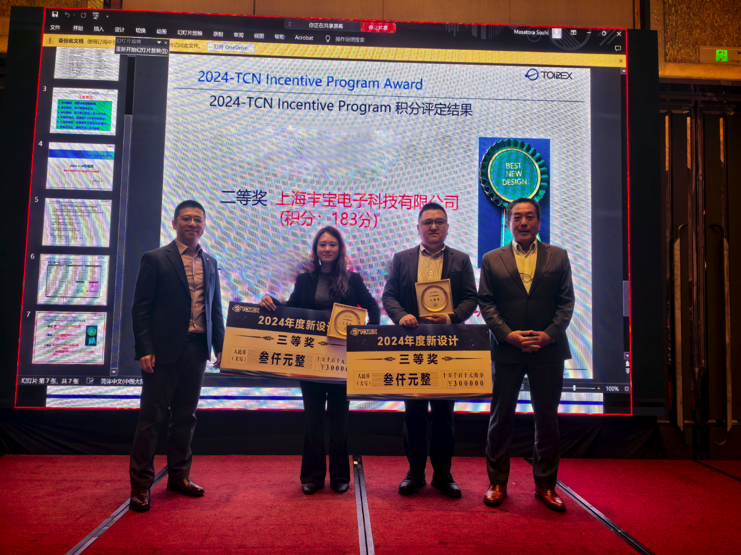 近日,上海豐寶電子信息科技有限公司(以下簡(jiǎn)稱(chēng)“豐寶電子”)在2024年度新項(xiàng)目DIN工作中表現(xiàn)卓越,獲得合作伙伴特瑞仕半導(dǎo)體株式會(huì)社(以下簡(jiǎn)稱(chēng)“特瑞仕”)的高度認(rèn)可。特瑞仕原廠(chǎng)特別授予豐寶北方團(tuán)隊(duì)“2024年度新設(shè)計(jì)二等獎(jiǎng)”、豐寶南方團(tuán)隊(duì)“2024年度新設(shè)計(jì)三等獎(jiǎng)”,以表彰其在市場(chǎng)推廣設(shè)計(jì)中的突出貢獻(xiàn)。