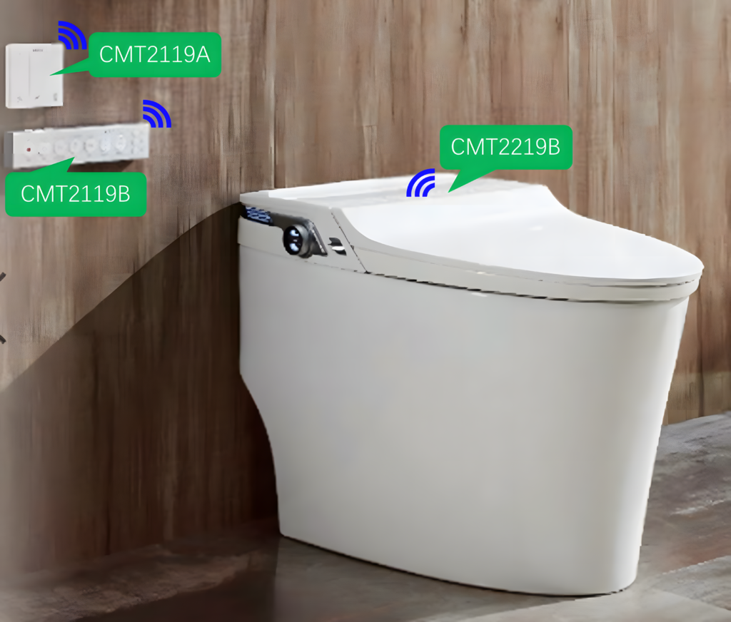 在智能馬桶簡易型自發(fā)電遙控器(動(dòng)能開關(guān))上選用了CMT2119A;全功能遙控器的功能按鍵多、用電池供電,選用CMT2119B;接收端一個(gè)接收需對二個(gè)發(fā)射,可選用CMT2219B解調(diào)遙控信號輸出給主控板,如下圖: