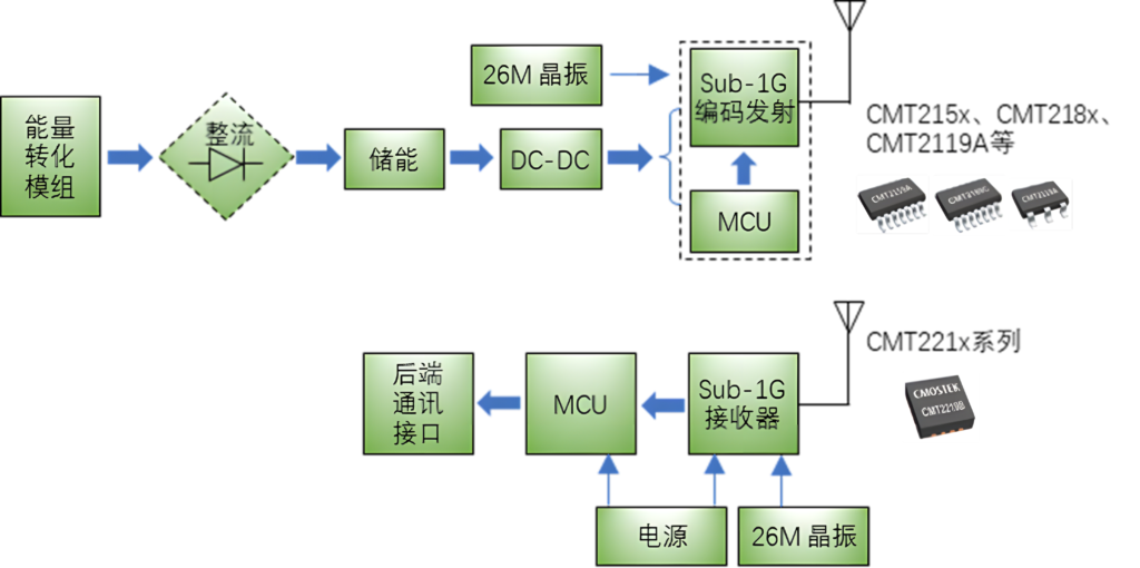 針對于自發(fā)電無線遙控設(shè)備,華普微推出了微能量收集無線發(fā)射芯片CMT2119A、CMT215x和CMT218x等系列,搭配接收芯片CMT221x系列一起使用,該無線發(fā)射芯片比較適于開關(guān)/按鍵較少的應(yīng)用場合。