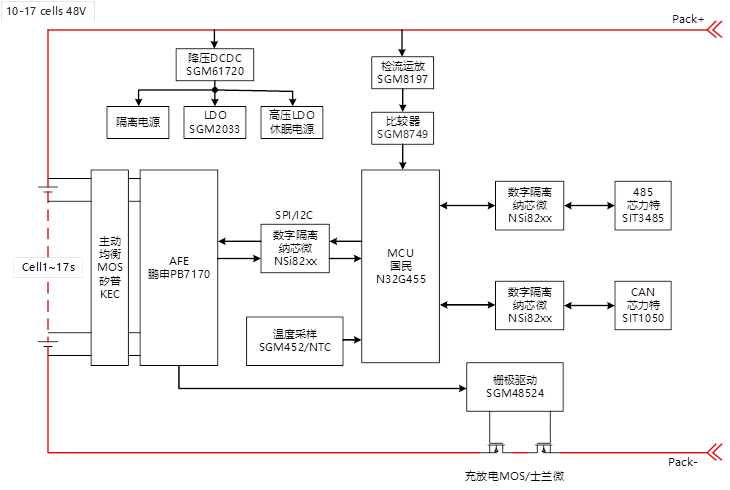 母線電壓取決于儲(chǔ)能電池系統(tǒng),48V系統(tǒng)為例,一級(jí)降壓BUCK及休眠LDO耐壓60V,如SGM61720/SGM61630;隔離電源有專用隔離電源芯片,或變壓器隔離分立方案等。