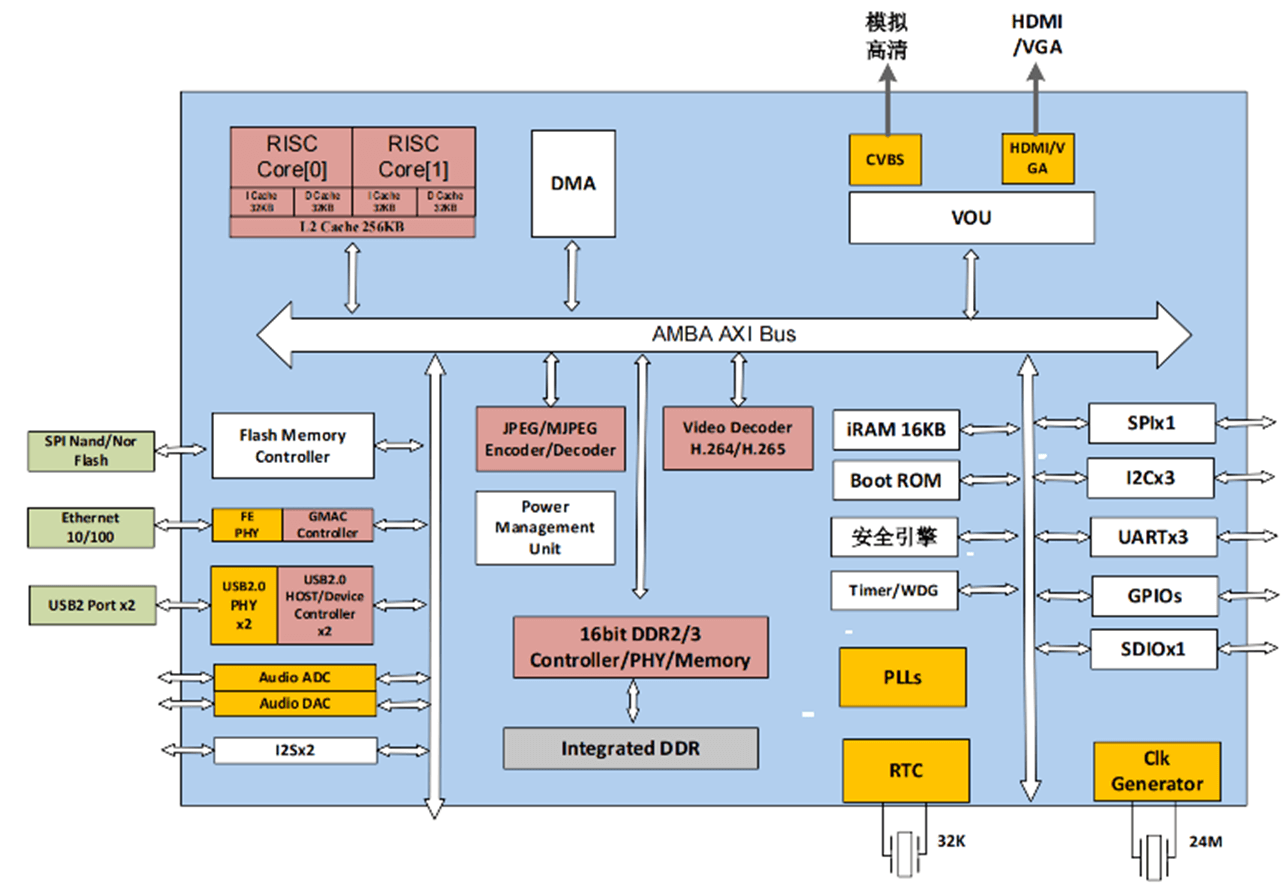 富瀚 MC6810E 采用RISC雙核處理器,最高工作頻率支持1.0GHZ,最大支持 4K30 幀輸出,運行Linux系統(tǒng),具備優(yōu)秀的解碼能力和豐富的接口。其主要特點如下:
