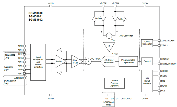 b. SGM58601 24-Bit、超低噪聲、60kSPS、8通道、Sigma-Delta ADC