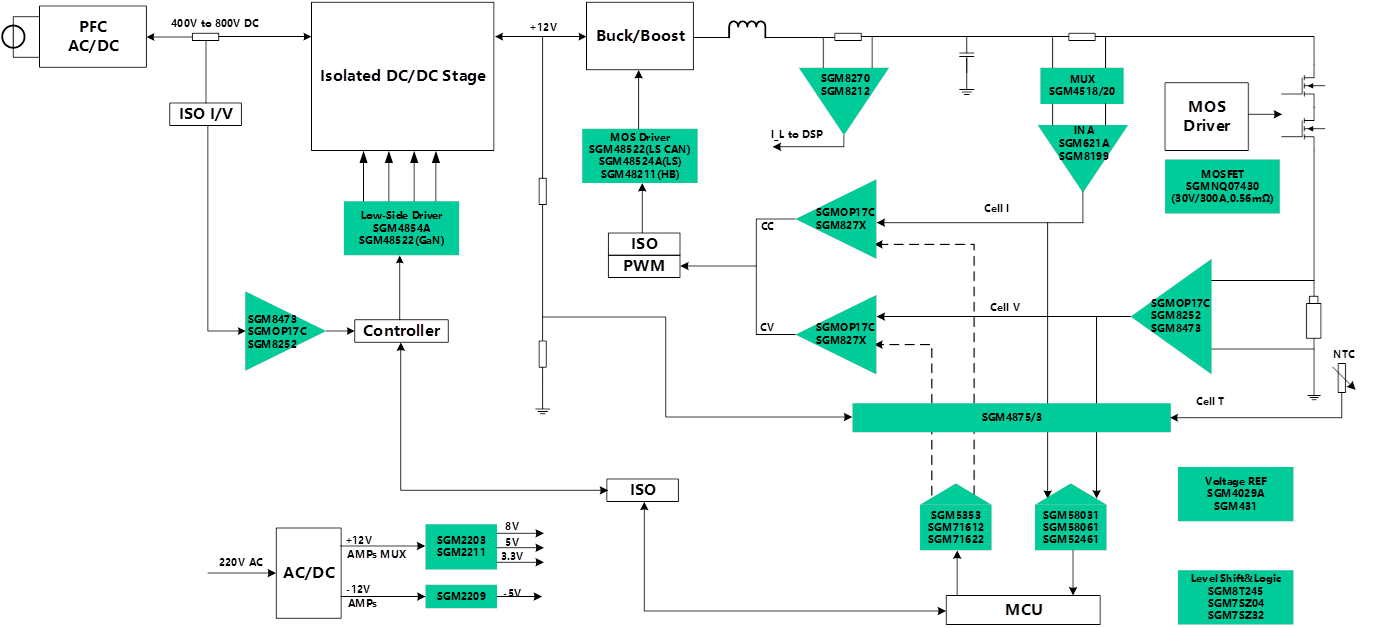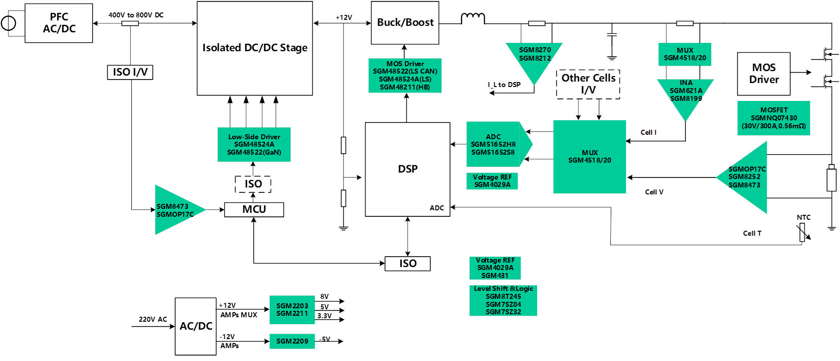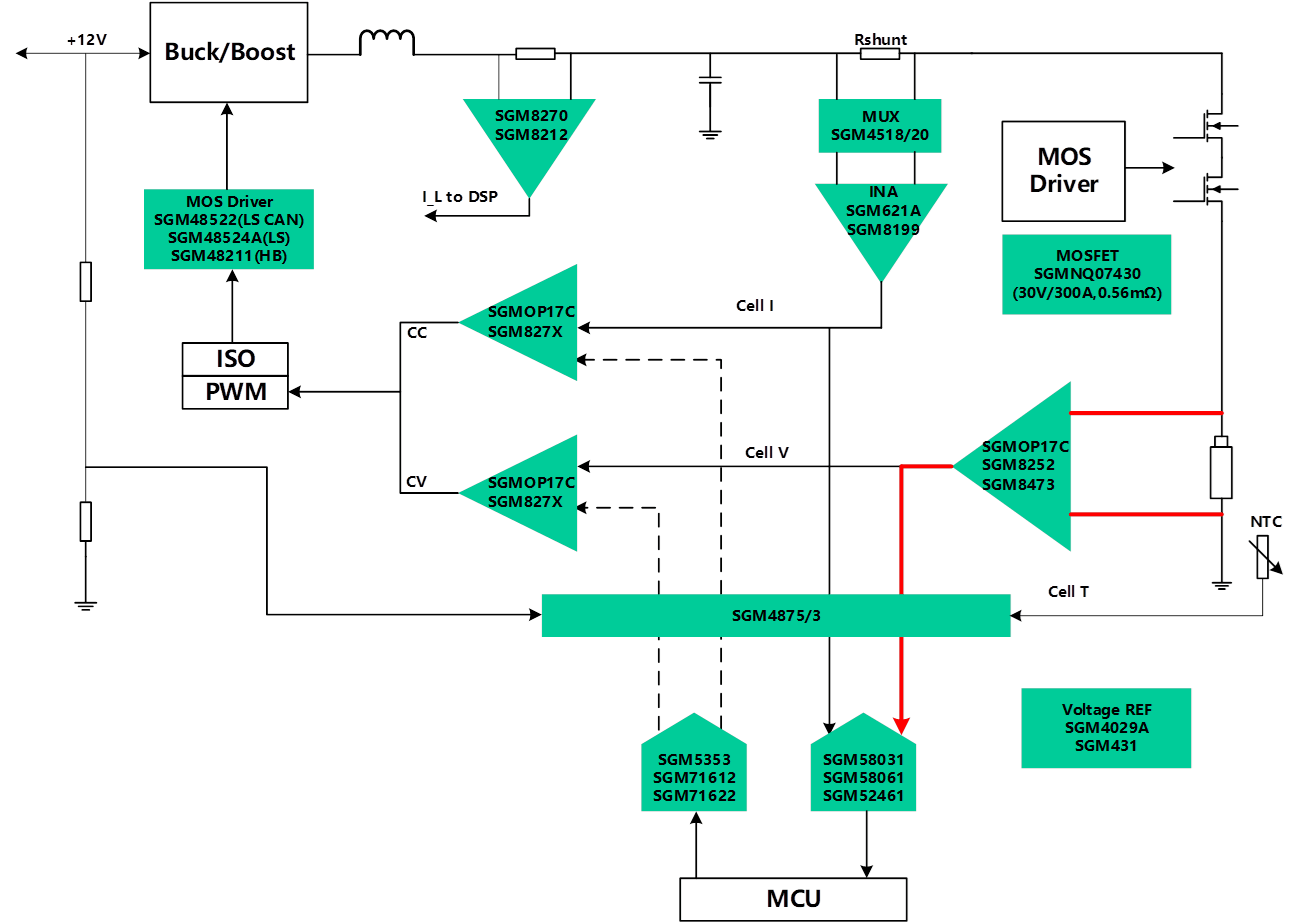 隨著個人便攜設備和新能源汽車快速發(fā)展,鋰電池市場需求持續(xù)增長,各個電池廠商對化成過程中鋰電池充放電電流/電壓測量的誤差要求也顯著提高,對整個測量控制電路中放大器、ADC/DAC、電壓基準的誤差要求也相應提高。同時,在激烈的市場競爭下,方案性價比高也是各個廠家要求之一。圣邦微電子能用更低成本實現(xiàn)更高精度、更高功率的電池化成I/V控制。