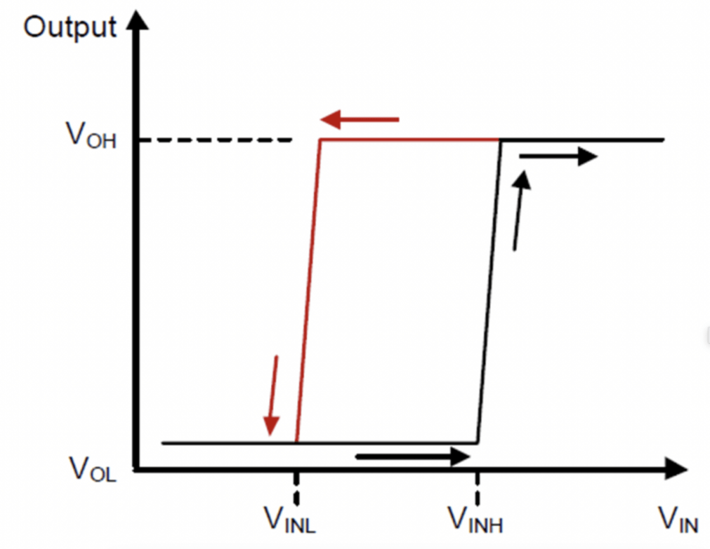 1. 欠壓保護+過門限打開功能:即輸入電壓高于VINH時打開DC/DC、LDO或負載開關,接通后級負載供電;同時在電源電壓低于VINL時關閉DC/DC、LDO或負載開關以斷開負載供電。輸入電壓VIN和電壓監(jiān)控器輸出端OUT(即DC/DC、LDO或負載開關的EN)的邏輯關系如下,從圖中可以看出該電路實現一個遲滯比較器的功能。