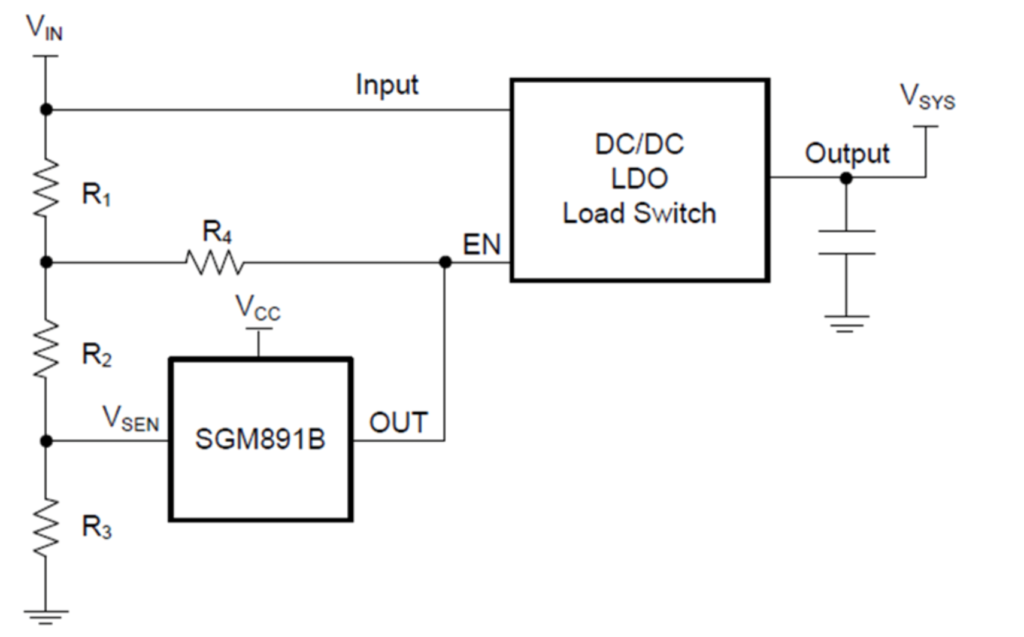 在電源系統(tǒng)中由于負載對電源電壓范圍有一定要求,同時給負載供電的輸入電壓可能有一定波動范圍,比如超級電容、電池等作為電源輸入時,其電壓往往有較大的波動范圍。那么在實際應用系統(tǒng)中就需要對電源進行一定控制,在監(jiān)控電源電壓的同時做出相應的動作,往往需要在電源電壓達到負載穩(wěn)定工作的電壓時才接通電源給負載供電,而在電源電壓跌落到負載即將無法穩(wěn)定工作時或超過負載能承受的電壓時就要關閉供電電路,同時電源的接通或關閉需要有一定的電壓保護區(qū)間,即遲滯功能,且遲滯區(qū)間靈活可調。