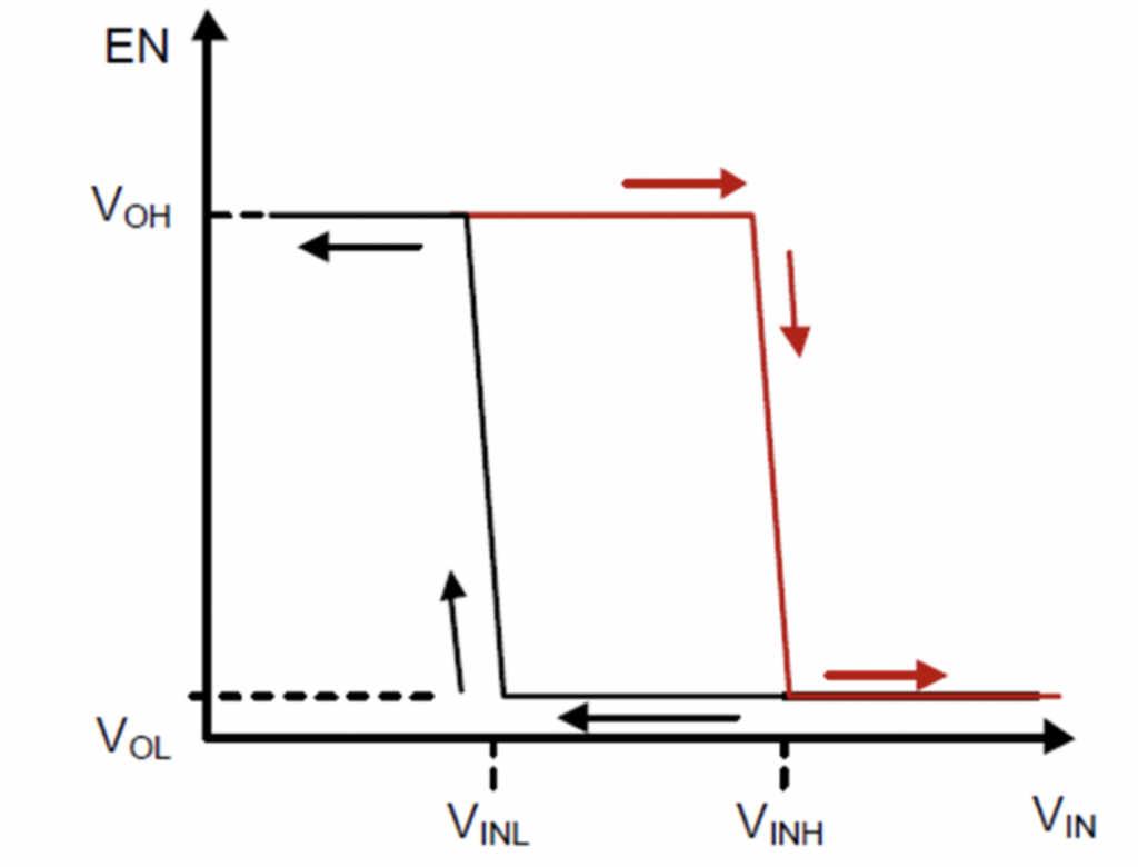 2. 過壓關斷+遲滯打開功能:即輸入電壓高于VINH時關斷DC/DC、LDO或負載開關,斷開后級負載供電;同時在電源電壓低于VINL時打開DC/DC、LDO或負載開關以接通負載供電。輸入電壓VIN和DC/DC、LDO或負載開關使能端EN的邏輯關系如下,從圖中可以看出該電路實現一個遲滯比較器的功能。