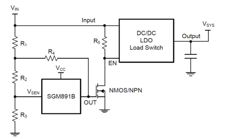 應用框圖所示,電源輸出接后級DC/DC、LDO或負載開關,同時采用電壓監(jiān)控器SGM891B監(jiān)控電源的輸出電壓,電壓監(jiān)控器輸出端OUT控制DC/DC(SGM61230等)、LDO(SGM2040等)或負載開關(SGM2523等)的使能端EN。在實際應用中: