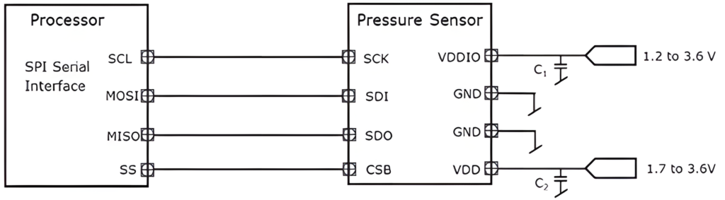應(yīng)用程序中使用這些系數(shù)將測量結(jié)果轉(zhuǎn)換為高精度壓力和溫度值。FIFO的結(jié)果可以存儲多達(dá)32個測量結(jié)果,從而降低了主機(jī)處理器輪詢速率。主機(jī)可以通過串行I2C或SPI接口讀取傳感器的測量和校準(zhǔn)系數(shù),傳感器的測量狀態(tài)可以通過SOD管腳上產(chǎn)生的中斷進(jìn)行判斷。