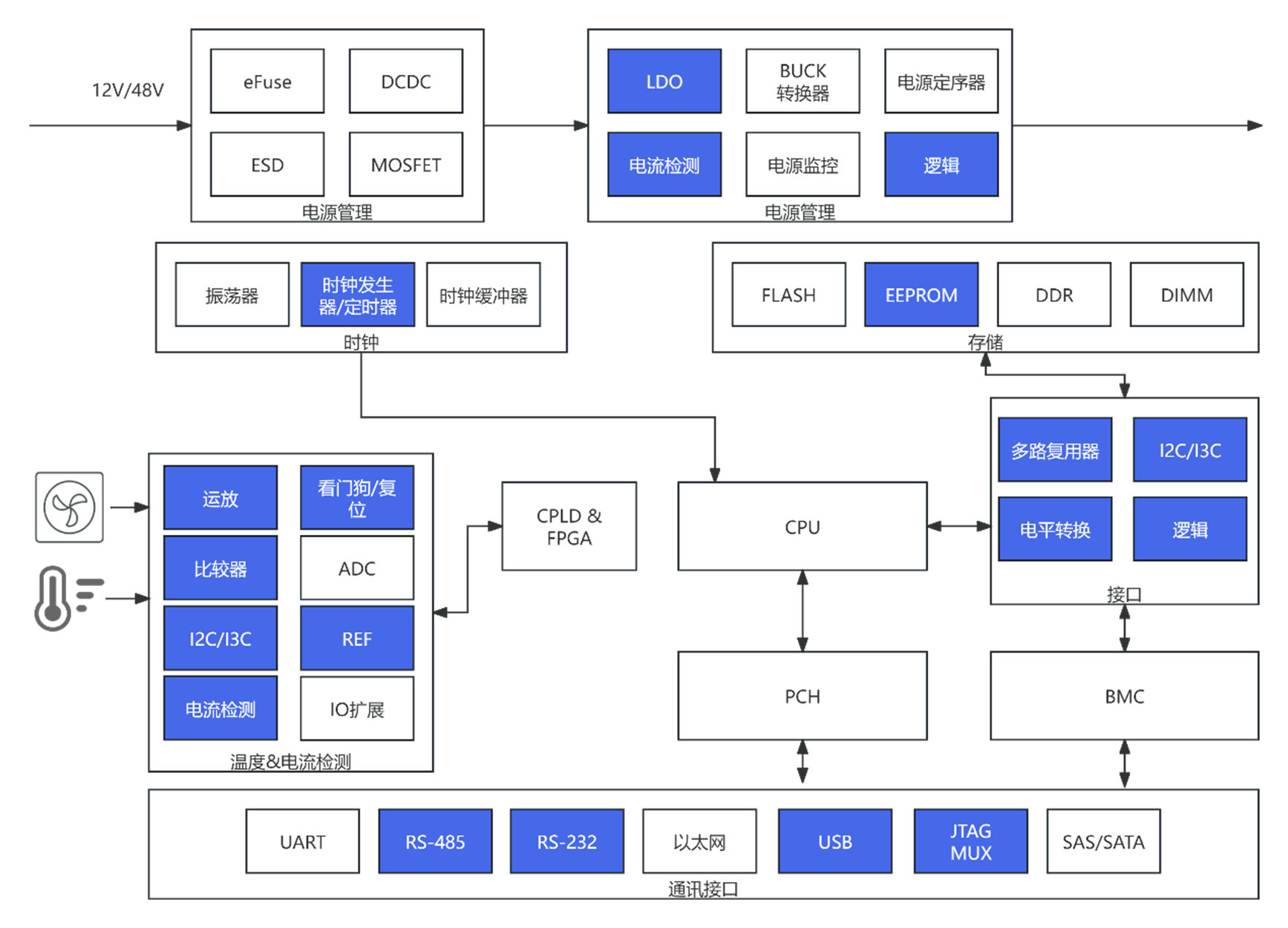 模擬開關(guān)/多路復(fù)用器在服務(wù)器中可應(yīng)用于總線擴(kuò)展、傳感器信號(hào)選通等應(yīng)用場(chǎng)景,例如: