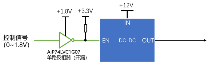 以下是一種使用開漏輸出的單路反相器對(duì)DC-DC控制信號(hào)進(jìn)行電平轉(zhuǎn)換的應(yīng)用,前級(jí)控制信號(hào)高電平為1.8V,而DC-DC要求使用>2V的高電平進(jìn)行控制,因此需要進(jìn)行電平轉(zhuǎn)換,以滿足DC-DC的使用要求。