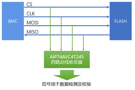 下圖是BMC與FLASH通過SPI進(jìn)行通訊的一種應(yīng)用,該應(yīng)用中需要對(duì)SPI信號(hào)進(jìn)行數(shù)據(jù)的檢測(cè)及校驗(yàn),因此需要將SPI信號(hào)外接到其他器件進(jìn)行處理。若直接將信號(hào)引出到后端,相當(dāng)于在SPI總線上額外增加了負(fù)載,對(duì)于高速SPI信號(hào)來說,會(huì)影響其信號(hào)完整性,嚴(yán)重時(shí)會(huì)導(dǎo)致數(shù)據(jù)讀寫錯(cuò)誤。