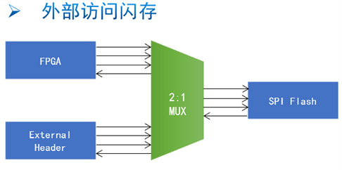 通過模擬開關(guān)/多路復(fù)用器,允許用戶通過FPGA和外部接口等多種方式訪問閃存。同時(shí),F(xiàn)PGA通過多路復(fù)用器,也可以擴(kuò)展訪問多個(gè)外部存儲(chǔ)器。由于模擬開關(guān)/多路復(fù)用器本身具有雙向?qū)üδ?,因此可以同時(shí)應(yīng)對(duì)以上兩種應(yīng)用。