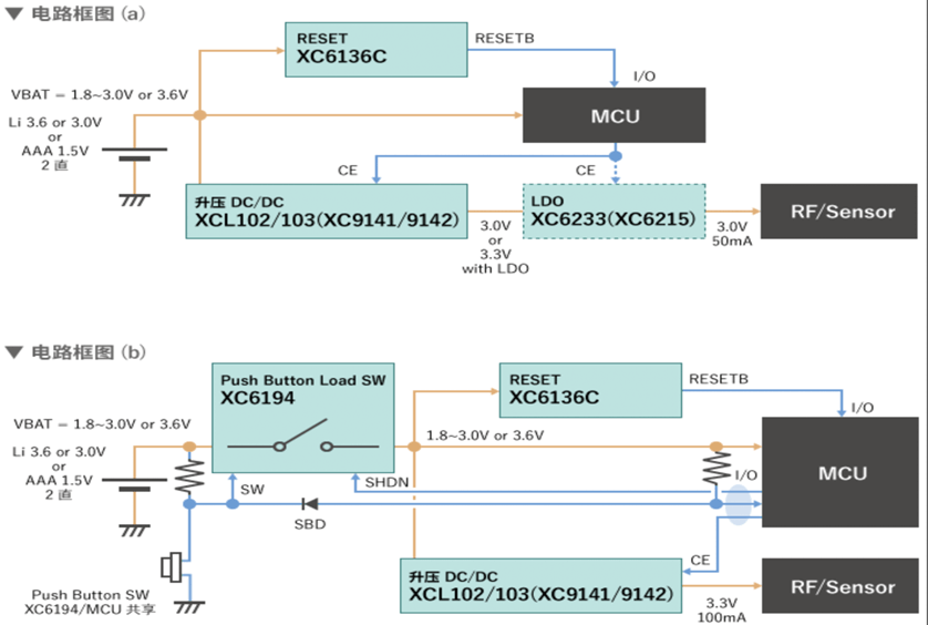電路框圖(a)是可將MCU直接連接到電池的情況。簡單的IoT/安全/可穿戴/醫(yī)療的小型器件多為這種結(jié)構(gòu)。近年來,在1.8V~3.8V的大范圍內(nèi)工作的MCU越來越多,這種情況下,無需使用電源IC,即可直接連接到電池使用。對此,RF和傳感器需要3.3V的固定電壓,即使工作電壓寬也為了要滿足規(guī)格,大多需要一定電壓以上的電壓,即需要升壓IC。