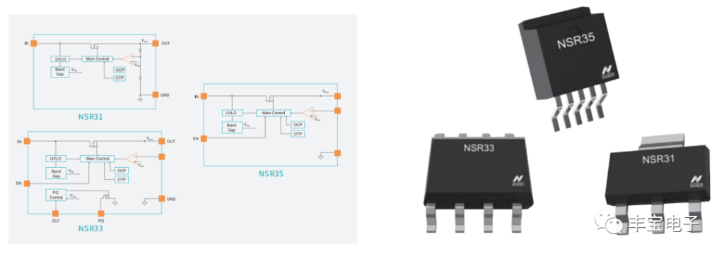 NSR31/33/35系列提供給硬件設(shè)計者充足的解決方案,有各種固定電壓版本:2.5V、3.3V和5.0V,也提供輸出可調(diào)選項(0.65V至18V)。此外,不同系列分別提供150mA,300mA,500mA的輸出電流能力,可由芯片內(nèi)部限制。此低功耗線性調(diào)節(jié)器還內(nèi)部集成了短路保護(hù)、過溫保護(hù)功能。 這些器件可在-40℃至125℃的環(huán)境溫度下運(yùn)行,提供多種封裝SOT223,SOT23DFN-8, MSOP-8 EP, SOP-8EP,TO252, TO263等,滿足不同設(shè)計需求。