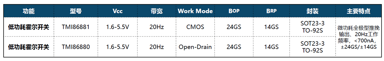 (1)霍爾開關(guān)TMI86880/1 1.6-5.5V全極性微功耗霍爾開關(guān)