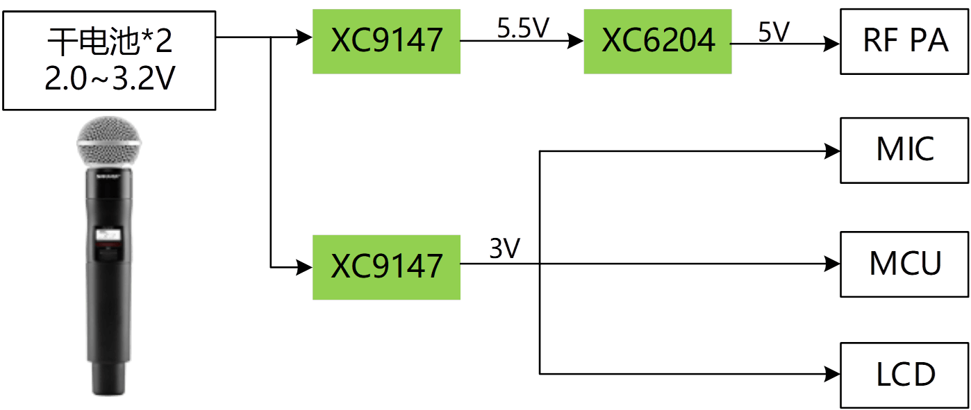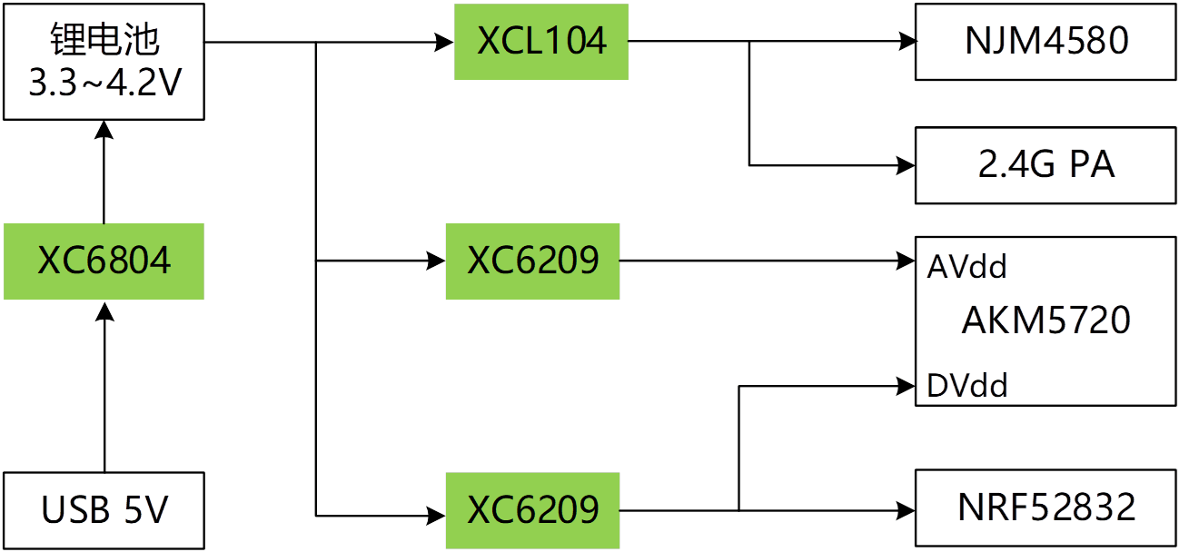 - 音頻功放供電及射頻PA供電,XC9147/1,XC9104升壓DCDC,優(yōu)秀電源紋波;高精度,低噪聲LDO XC6209/4,進一步提升電源表現(xiàn)